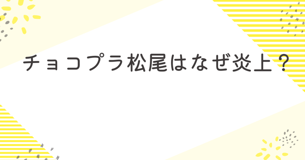 チョコレートプラネットの松尾駿さんがSNSを巡る持論を展開して炎上しておりますね。 なぜ松尾さんが炎上したのかわからないという方もいるのではないでしょうか? 今回はそんな松尾さんの炎上理由について調査をしていこうと思います。 最後までお願いし... -